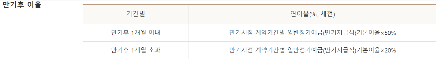 물론, 여기에도 만기 후 이율과 중도해지 이율이 적용되는데 내용은 다음과 같습니다.