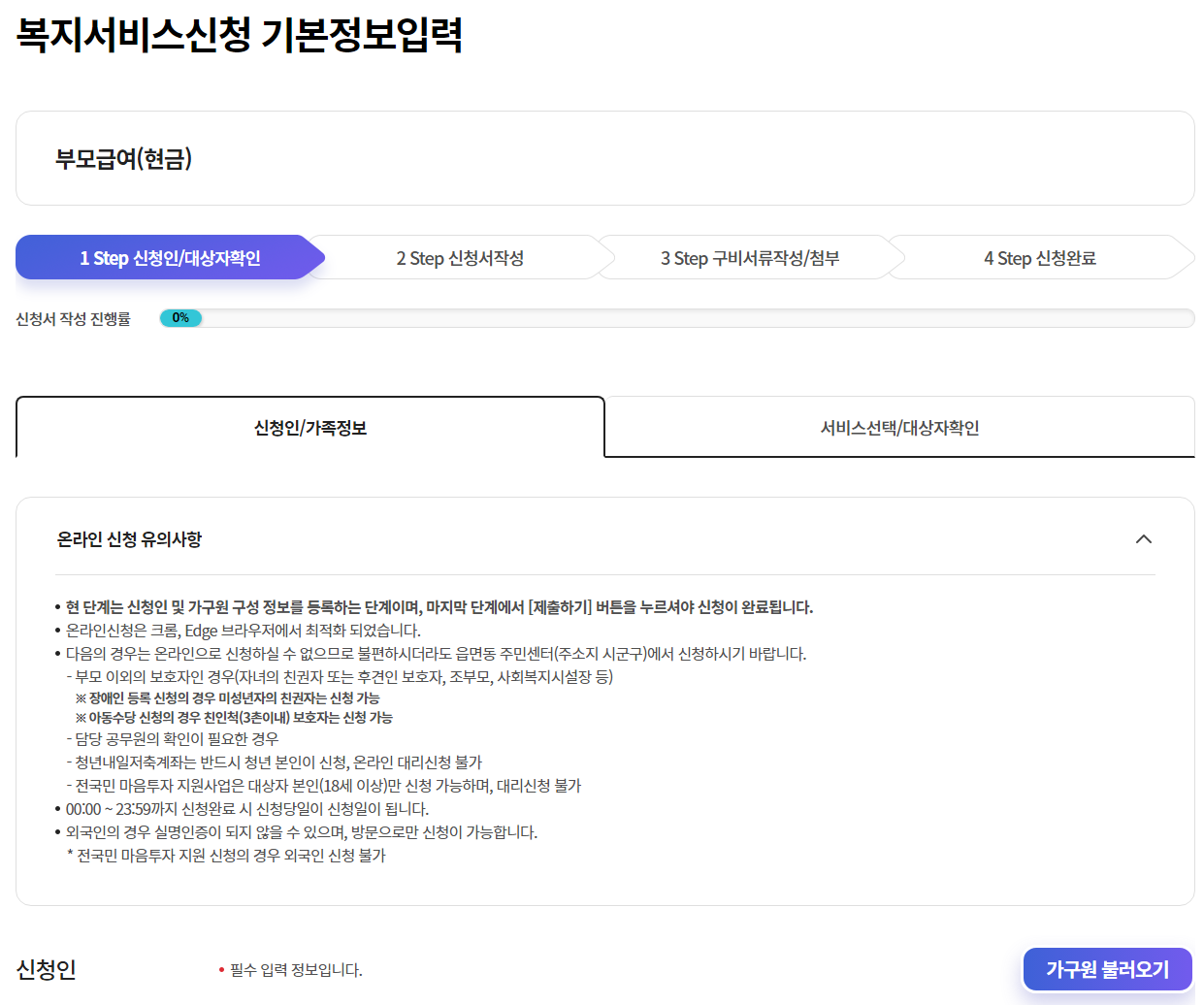이제 본격적인 신청 절차 차례인데, 첫번째로 신청인/대상자 확인을 하게 됩니다.