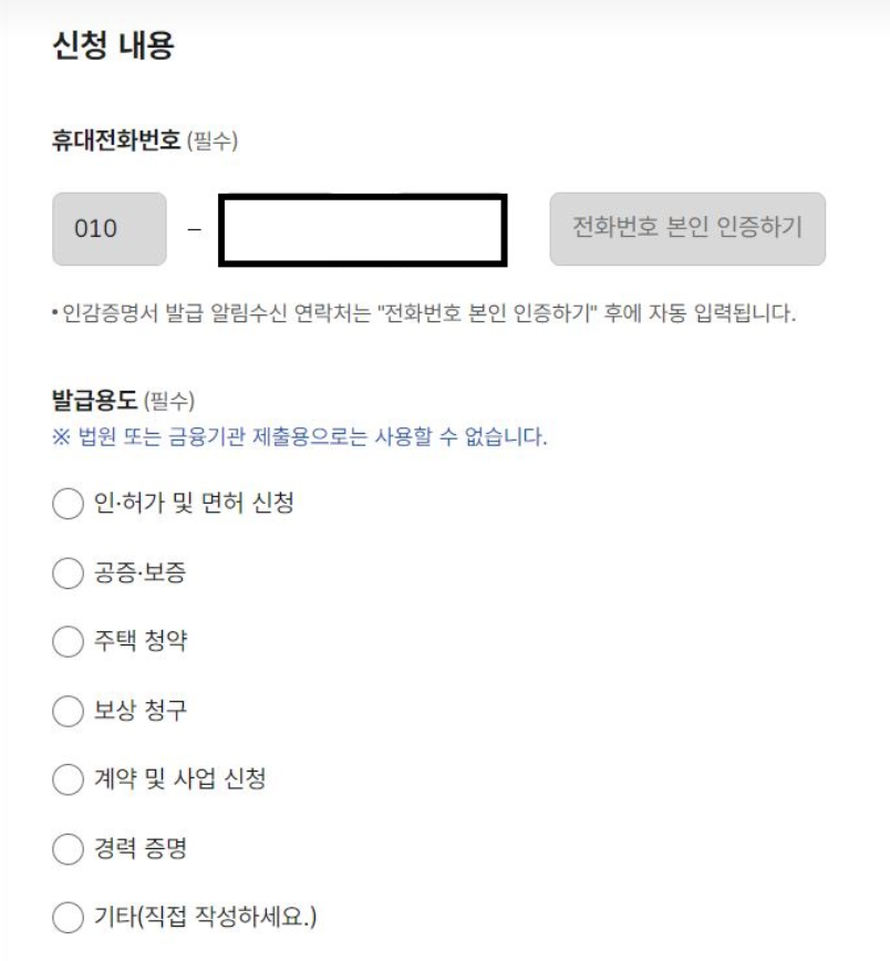 신청하기 단계로 들어서면, 휴대폰 인증을 한 후 발급용도를 선택해야 하는데,