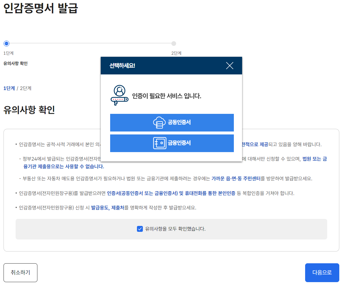 공동 인증서 또는 금융인증서가 필요한데, 만약 없으시다면 은행에서 무료로 발급받을 수 있으니 먼저 준비해주세요.