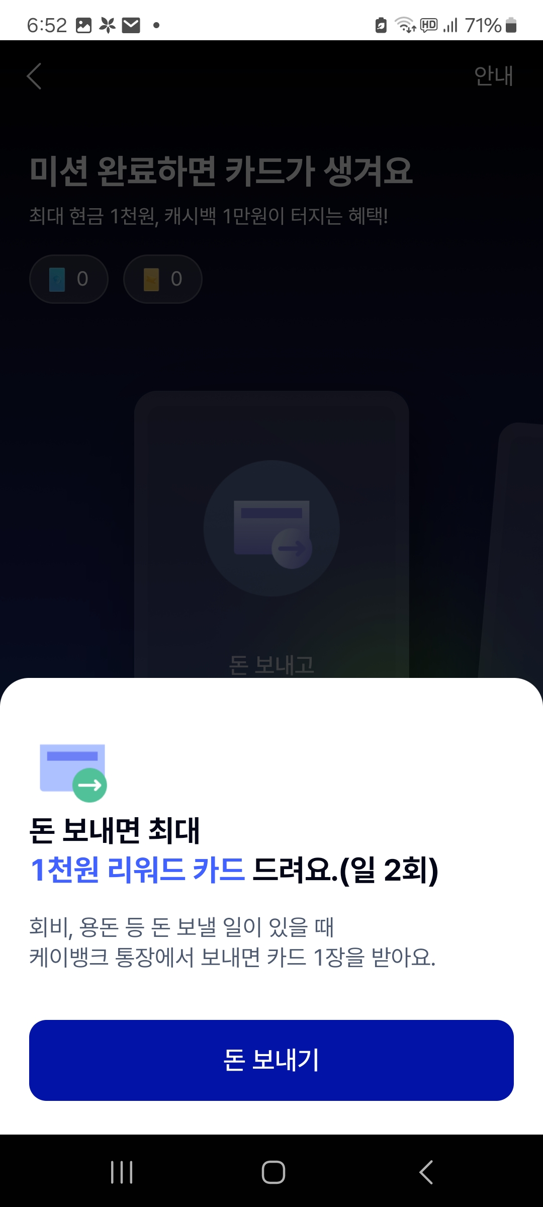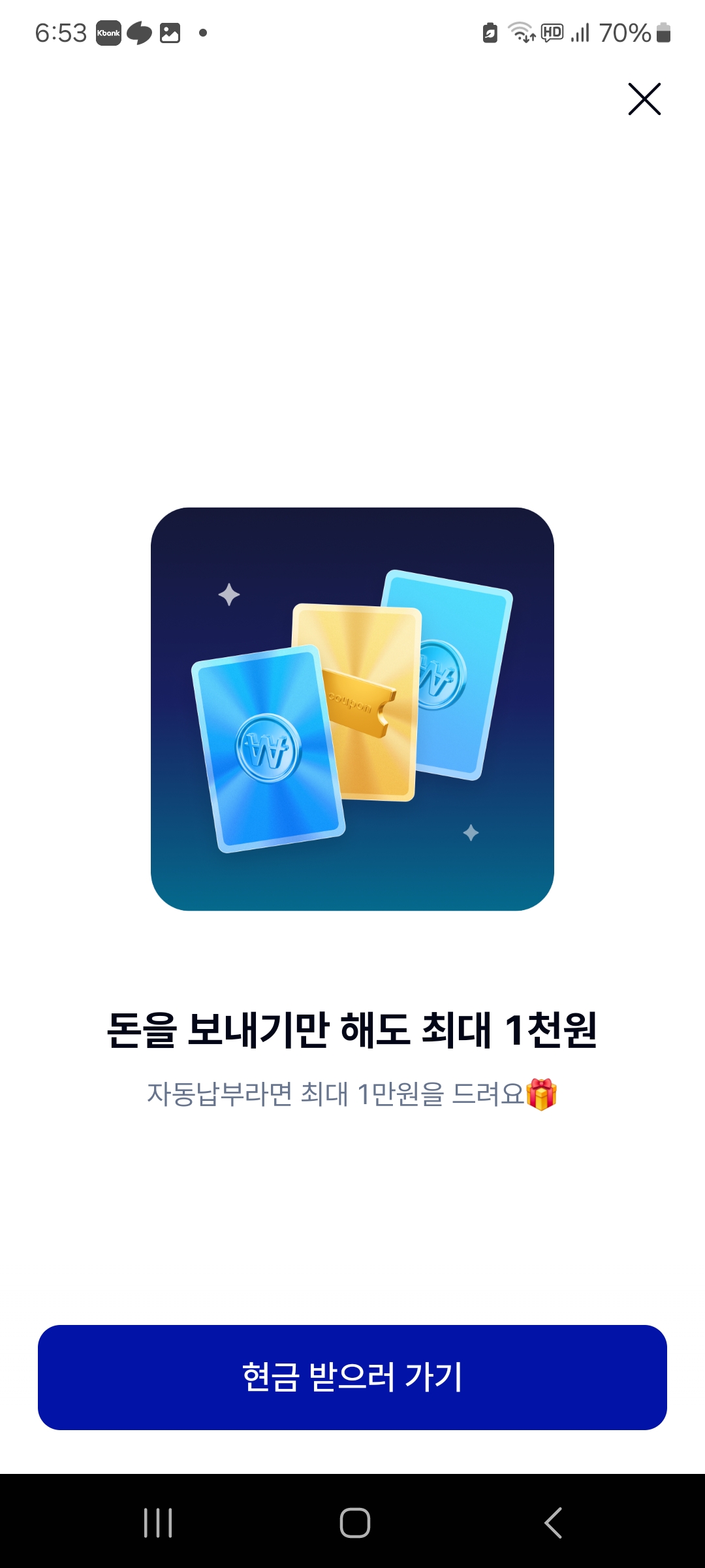 케이뱅크 계좌로 입출금 거래가 있을 시 랜덤으로 한 장씩 뽑아서 최대 1천원까지 받으실 수 있고,