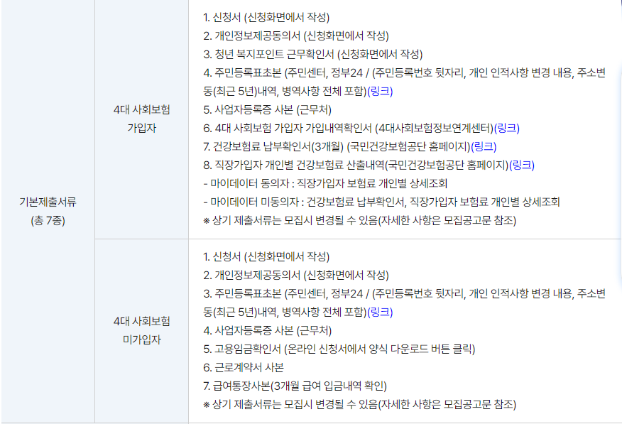 5) 참고사항 : 제출서류는 접수기준일('24. 8. 1.) 이후 발급된 서류만 인정하고, 마이데이터에 동의 시 주민등록초본과 4대 사회보험 가입자 가입 확인내역서, 건강보험료 납부확인서 별도 제출하지 않고 신청할 수 있습니다.