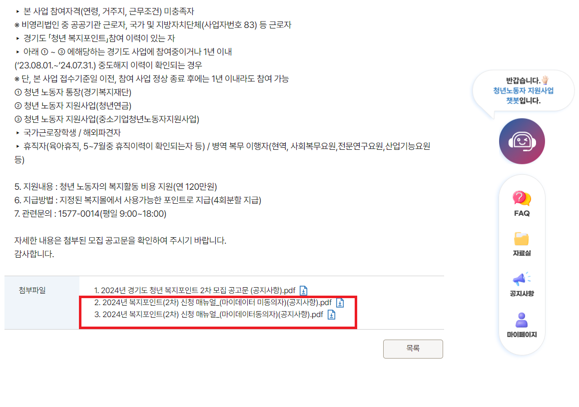 그 외 상세매뉴얼은 [경기도일자리재단 - 청년 노동자 지원사업] 사이트 상단에 [소식안내] - [공지사항] - 102번 글을 클릭하시면 첨부파일에 마이데이터 동의여부에 따른 매뉴얼이 있으니 참고하셔서 신청에 도움이 됐으면 좋겠습니다.